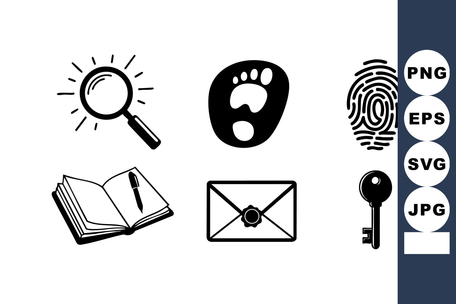 A bold graphic composition displays six black icons including magnifying glass with sun rays footprint fingerprint open book with pen sealed envelope and key in simple style creative and clear design with an informative mood