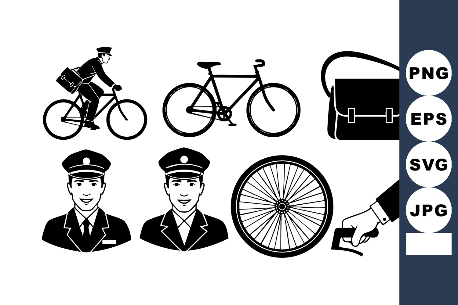 A bold vector collection shows a postal worker riding a bicycle with additional icons including bicycle parts and a mailbag, perfect for delivery or courier themed designs. Clean and professional style creates a dynamic and practical mood.