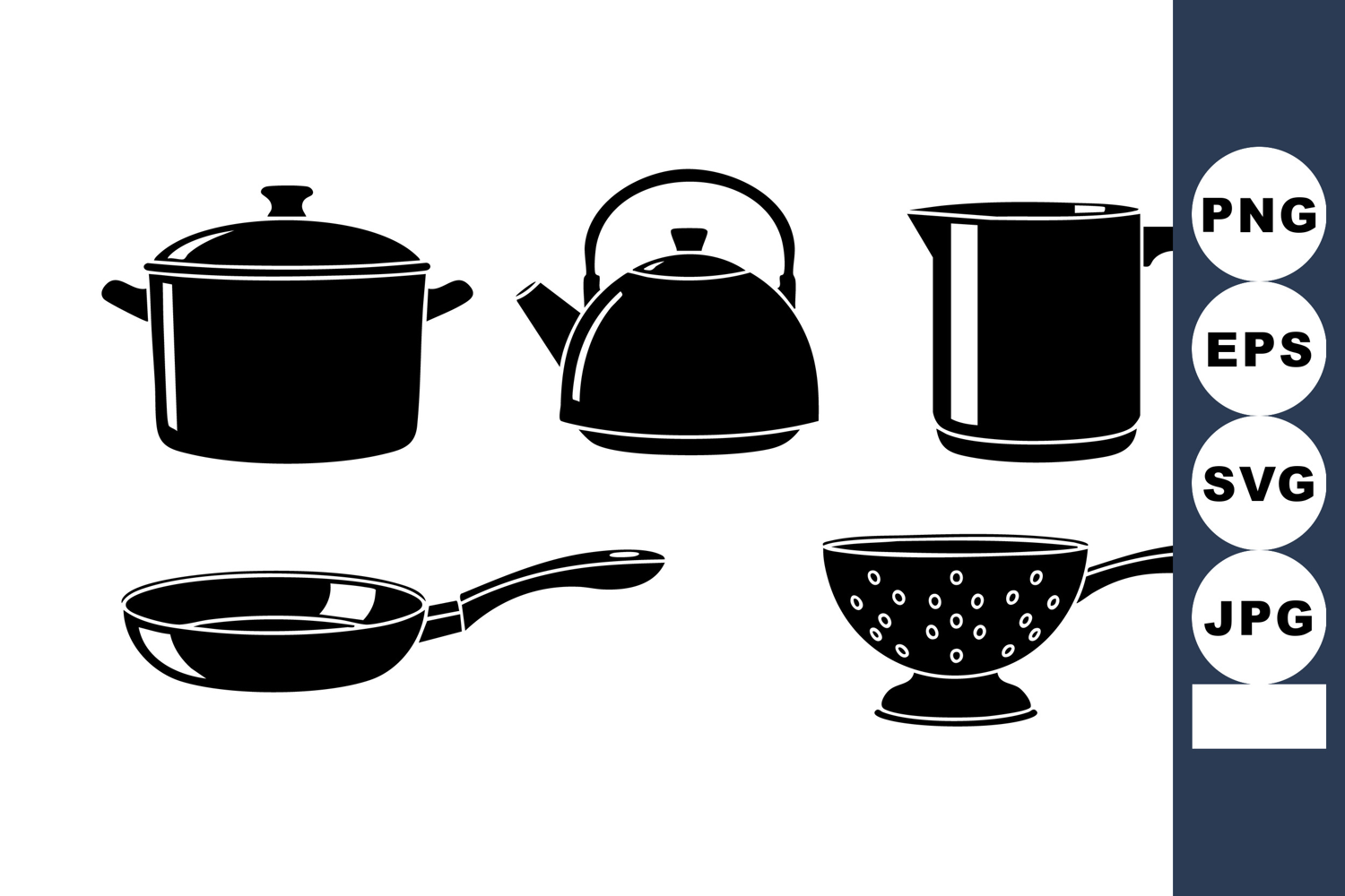 Bold silhouette design displays various kitchen utensils including a pot kettle saucepan frying pan and colander in a clean minimal style perfect for cooking themes and culinary projects edgy