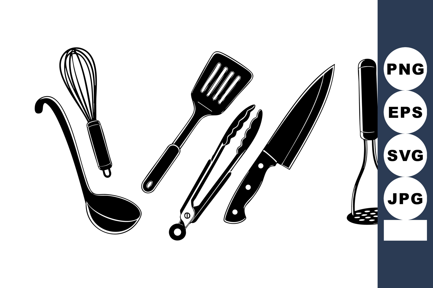 A bold silhouette design displays essential kitchen utensils including a ladle whisk spatula tongs knife and masher suitable for cooking or culinary themed projects edgy