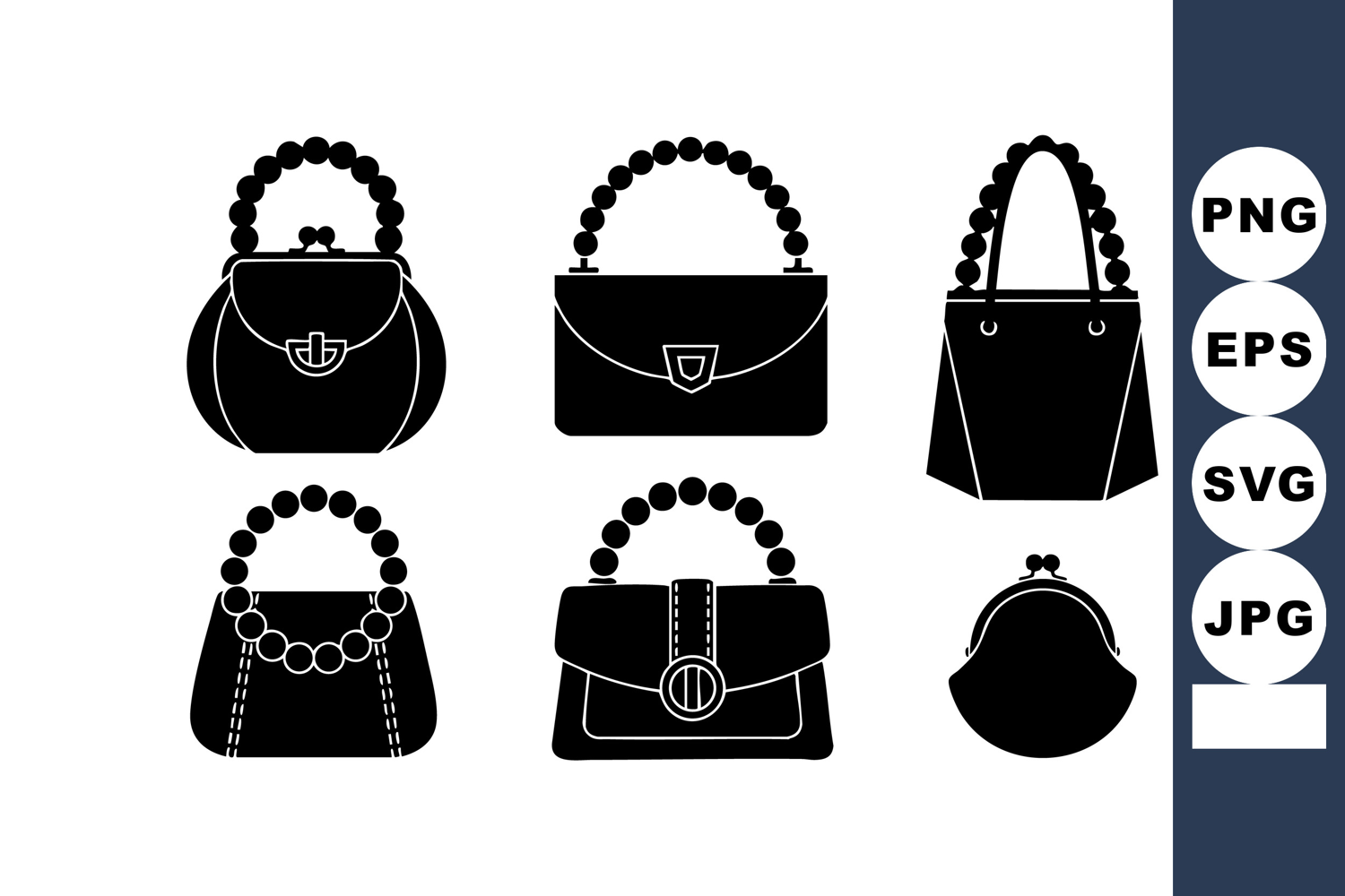 Elegant black handbag silhouettes showcase diverse purse styles featuring beaded handles and clasps suitable for fashion design or accessory branding projects in a stylish and chic mood