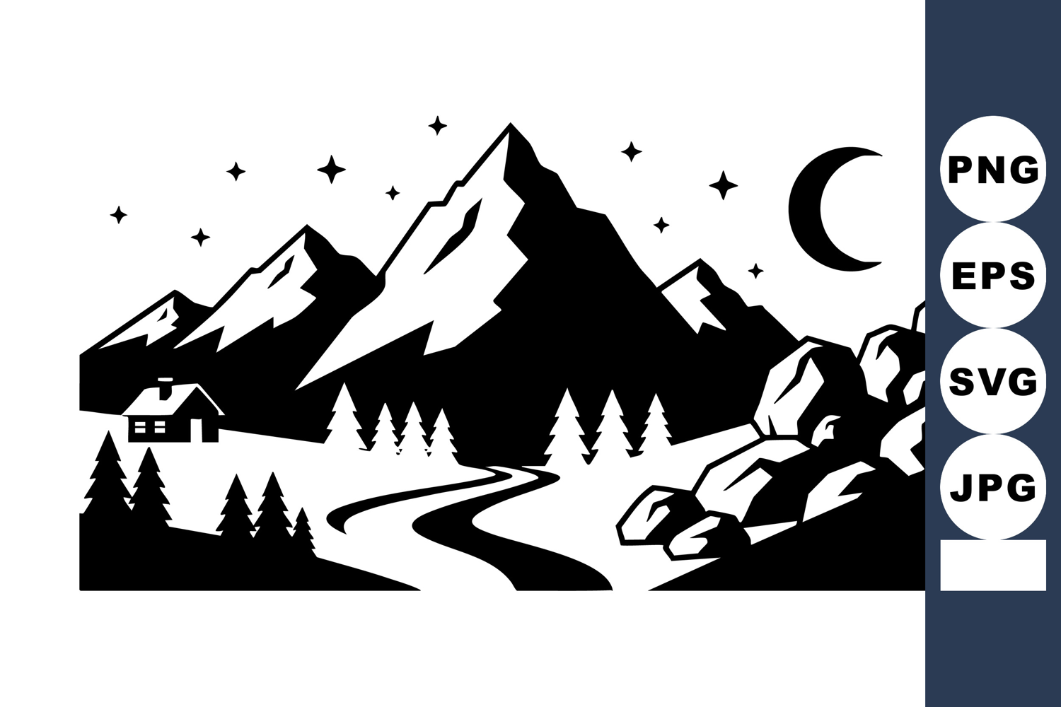 A black and white vector illustration portrays a mountain landscape with a winding river pine trees a cabin and a crescent moon in the night sky creating a calm peaceful mood