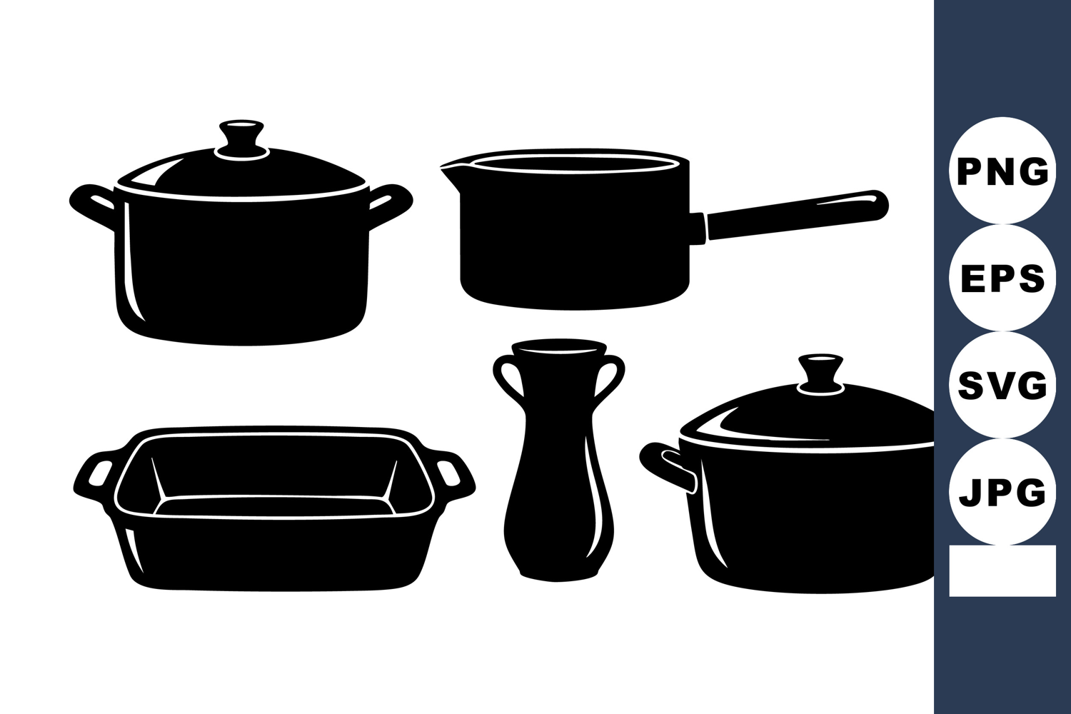 Bold silhouette design displays essential kitchen cookware including pot saucepan pan tray and jug perfect for cooking themed projects or culinary illustrations in a clean style edgy