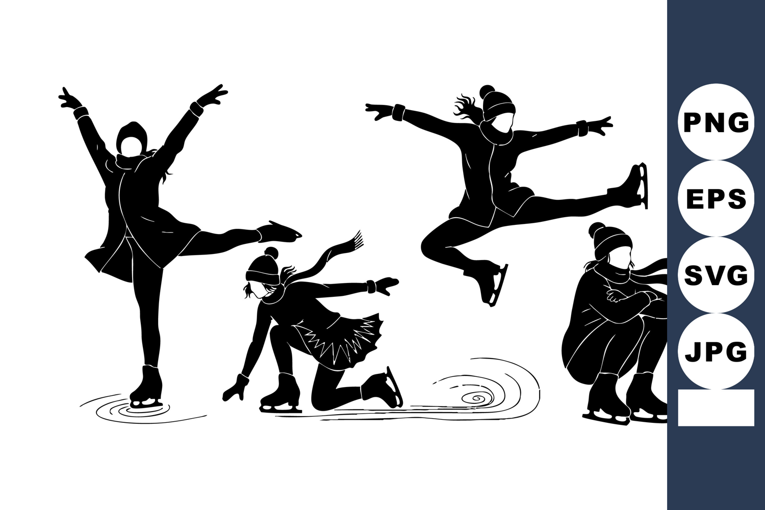Black Silhouette Figures Winter Hats Scarves Stylish Vector Design People Ice Skating Winter Clothing Silhouettes Dynamic Skating Poses Ice Skating Moves Cold Season Energy Skating Jump Spin Balance Freeze Glide