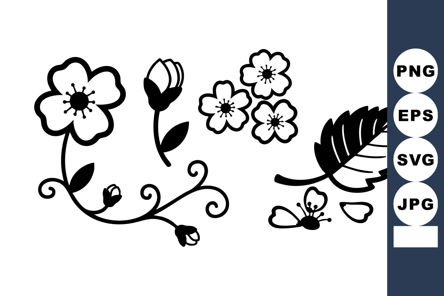 Elegant black and white floral vector includes simple flowers leaves and delicate small blossoms ideal for design projects with a natural decorative style calm