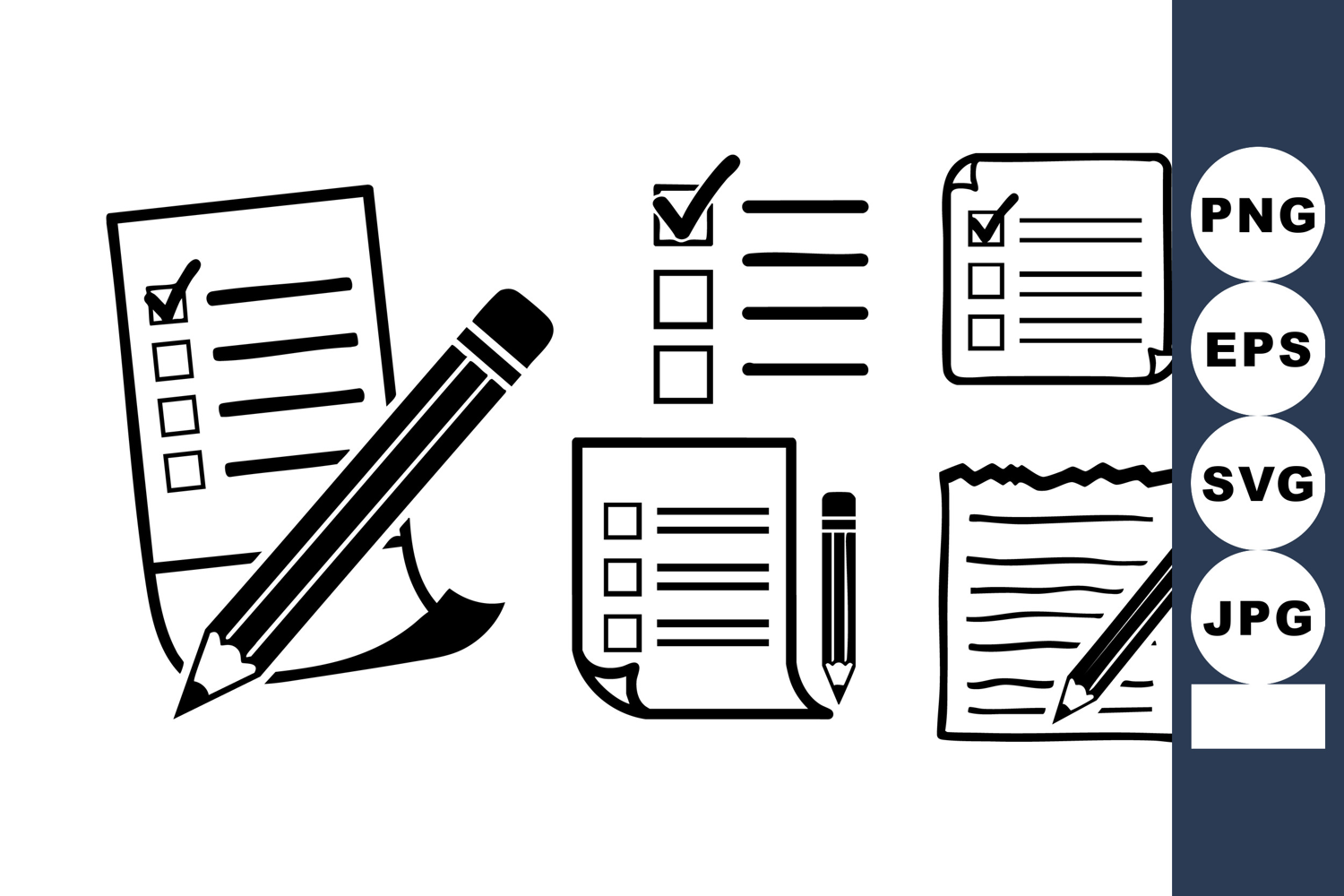 A collection of checklist and pencil icons in black line art style shows various forms of notes and marked tasks, ideal for productivity or organization themes, minimalistic and clear design