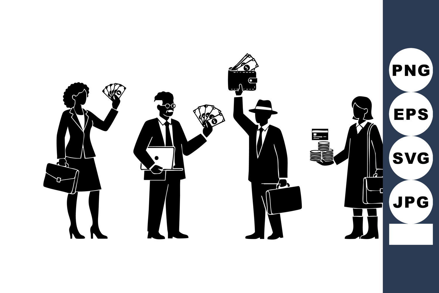 A bold silhouette design shows business people holding cash and credit cards with briefcases and documents conveying finance and commerce themes in a professional and dynamic mood