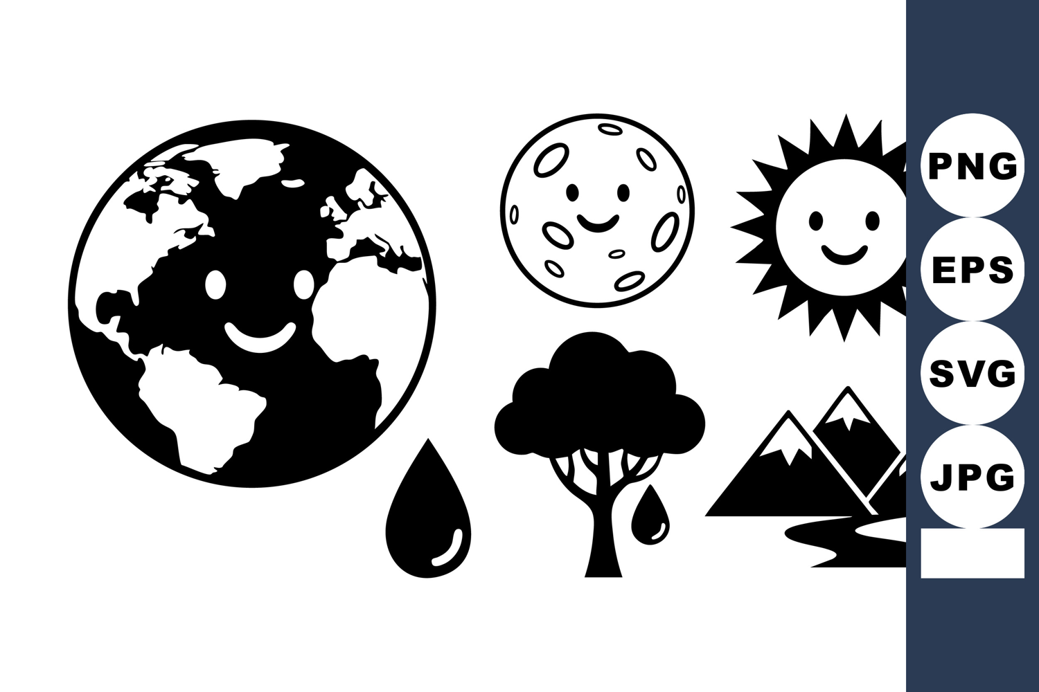 Black White Icons Earth Moon Sun Simple Flat Style Water Drop Mountains Smiling Earth Moon Moon Sun Tree Tree Water Drop Mountains Icons Vector Environmental Educational Themes Cheerful Nature Icons
