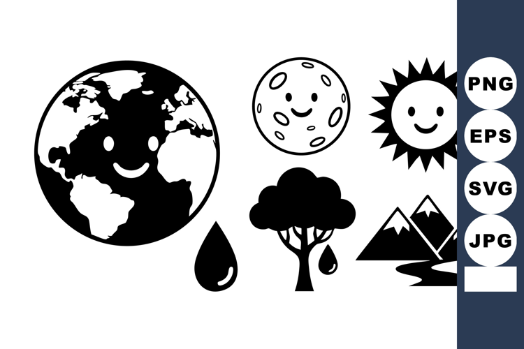 Playful black and white icons depict a smiling earth moon sun tree water drop and mountain range in a simple flat style suitable for environmental or educational themes. Cheerful.