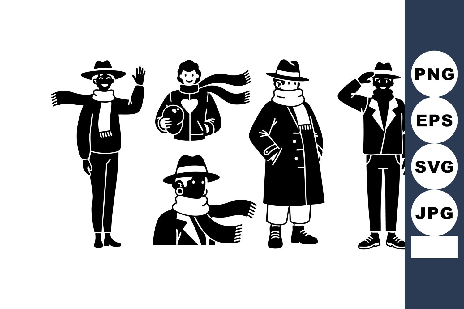 A collection of black silhouette figures dressed in warm winter clothing with scarves hats and coats showing diverse winter fashion styles in a minimalist design style calm mood