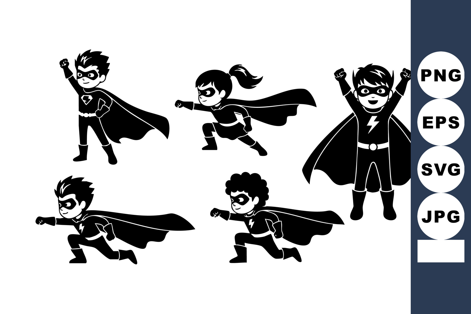 Black Silhouette Style Children Dressed Superheroes Superheroes Flying Posing Children Superhero Costumes Playful Children Flying Children Striking Poses Heroic Children Silhouettes Superhero Costume Designs Children Wearing Masks Children With Capes