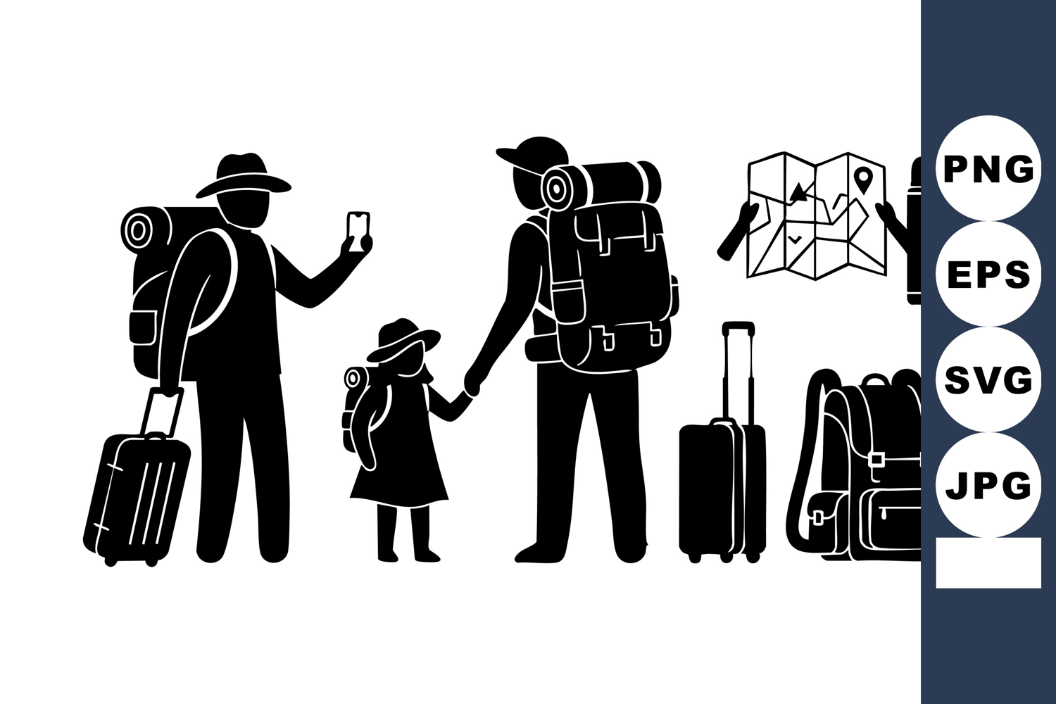 Silhouettes of a family hiking with backpacks and travel luggage include a father, mother, and child holding hands, plus travel map and thermos, showing adventure and exploration mood.