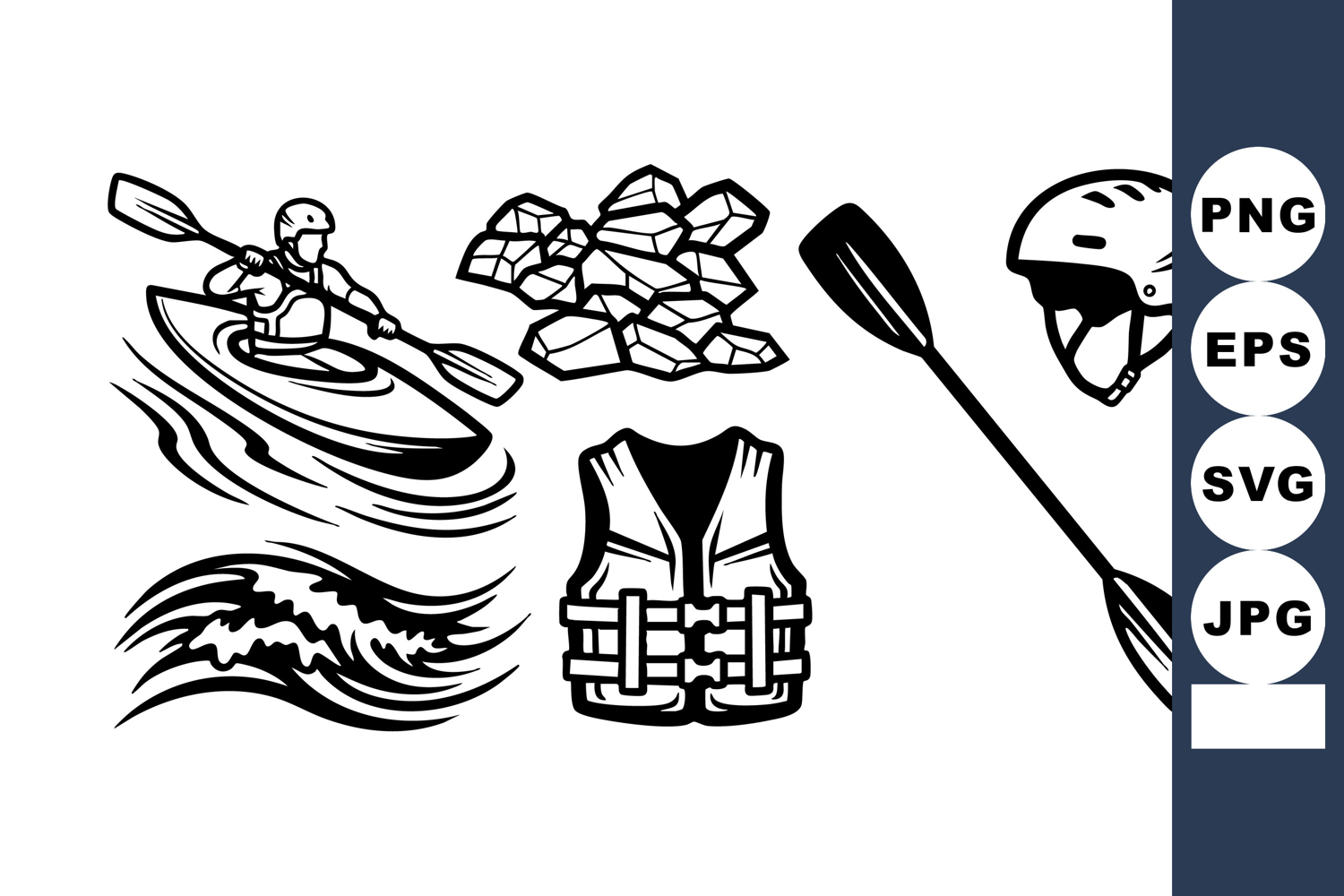 A dynamic vector illustration displays kayaking gear including a paddler, helmet, paddle, life vest, rocks, and water waves in bold black and white style perfect for adventure themes.