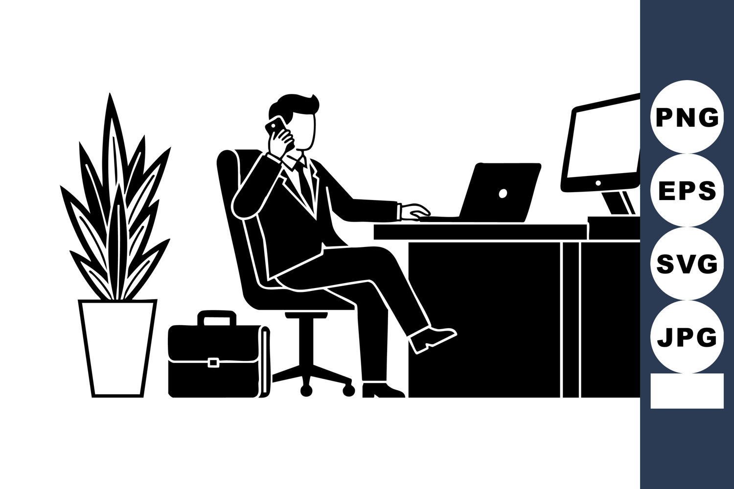 A black silhouette of a businessman sitting at a desk talking on the phone with a laptop and computer monitor nearby plus a potted plant and briefcase in a professional workspace setting. Calm and focused mood.