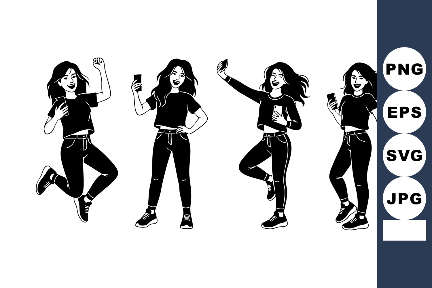 Woman Holding Phone Young Woman Smartphone Joyful Woman Poses Happy Woman Vector Smiling Woman Smartphone Woman Casual Clothing Woman Jumping Vector Confident Woman Pose Woman Social Media Woman Energetic Motion
