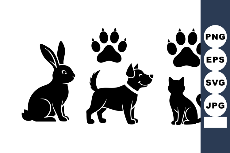 Bold silhouette design displays a rabbit dog cat and two paw prints in black on white background perfect for pet or animal themed projects with clean simple style and clear shapes peaceful
