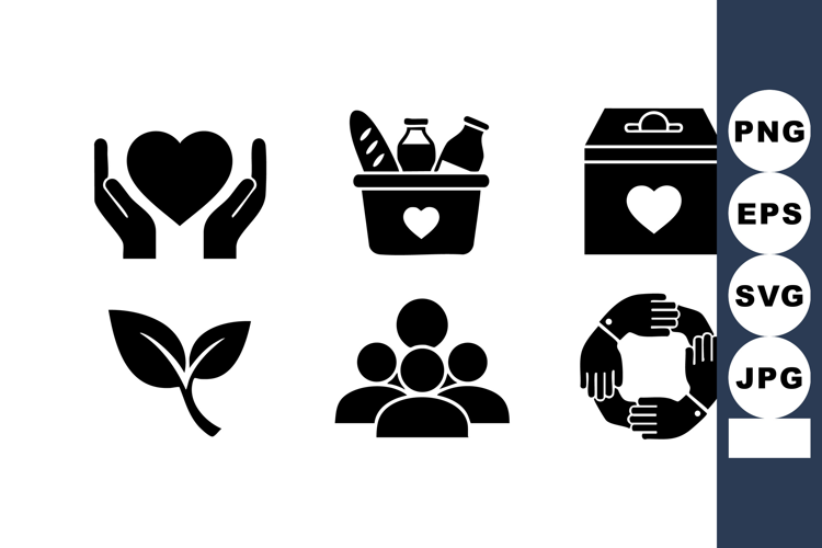 A collection of simple black icons shows hands holding a heart food donation box leaves and a united group symbolizing care support and community spirit in a clean style calm mood