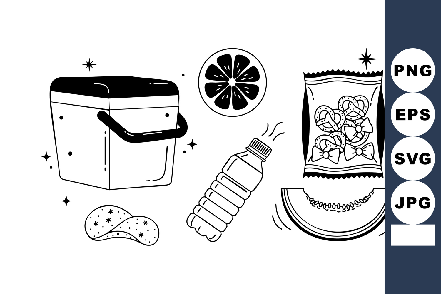 A cool box with handle is surrounded by potato chips, a bottle of drink, a sliced orange, and a melon wedge in a simple black and white style for casual picnic designs. Relaxed and inviting.