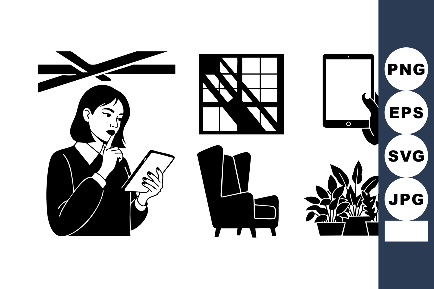 A thoughtful woman uses a tablet while surrounded by home interior items including a chair, window, and potted plants in a minimalist black silhouette style calm and focused mood