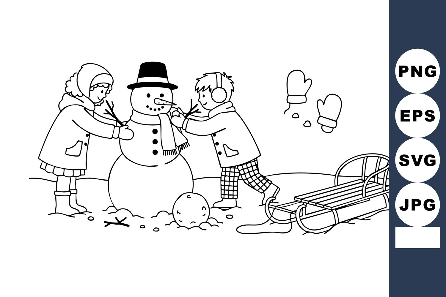 Two children dressed in warm winter clothes build a cheerful snowman while a sled and mittens lie nearby in a playful snowy scene conveying joy and fun cold weather activity playful