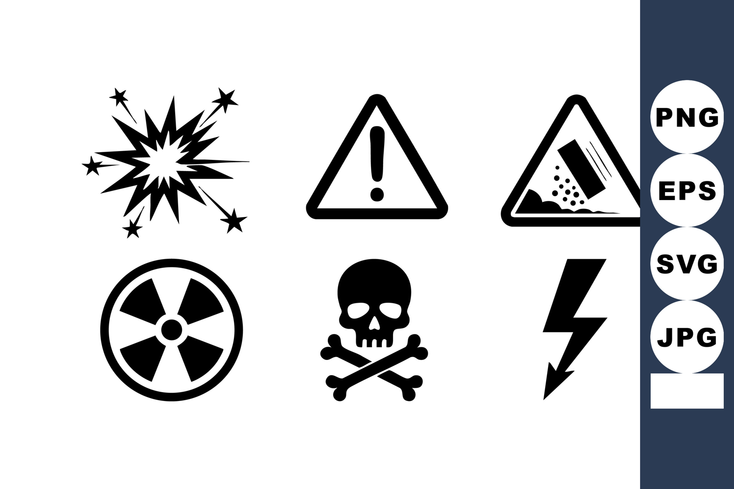 A bold graphic collection displays various hazard and danger safety icons including explosion, warning, radioactive, skull with bones, and lightning bolt for alert purposes edgy