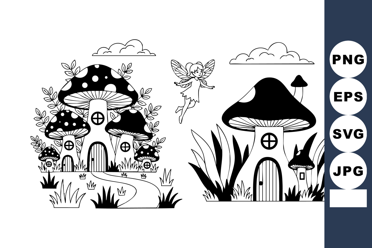 Line Art Illustration Mushroom House Illustration Fairy Tale Mushroom Black White Mushroom Peaceful Outdoor Scene Magical Charming Scene Floating Fairy Wings Garden Grass Plants Storybook Fantasy World Cute Playful Fairy