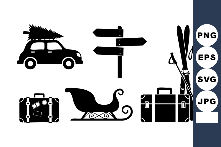 Black Silhouette Icons Travel Winter Vacation Car With Luggage Directional Sign Posts Skis With Poles Suitcases And Sleigh Winter Holiday Vibes Travel Design Projects Modern Clear Style Winter Travel Essentials