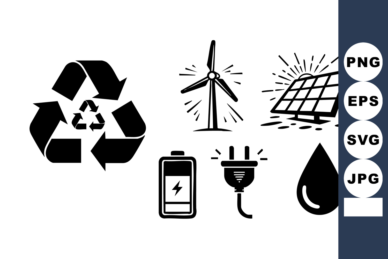 A bold vector set displays icons representing renewable energy with recycling, wind turbine, solar panel, battery, electric plug, and water drop in a simple striking style, illustrating sustainability and green technology themes in an impactful and clean design, vibrant.