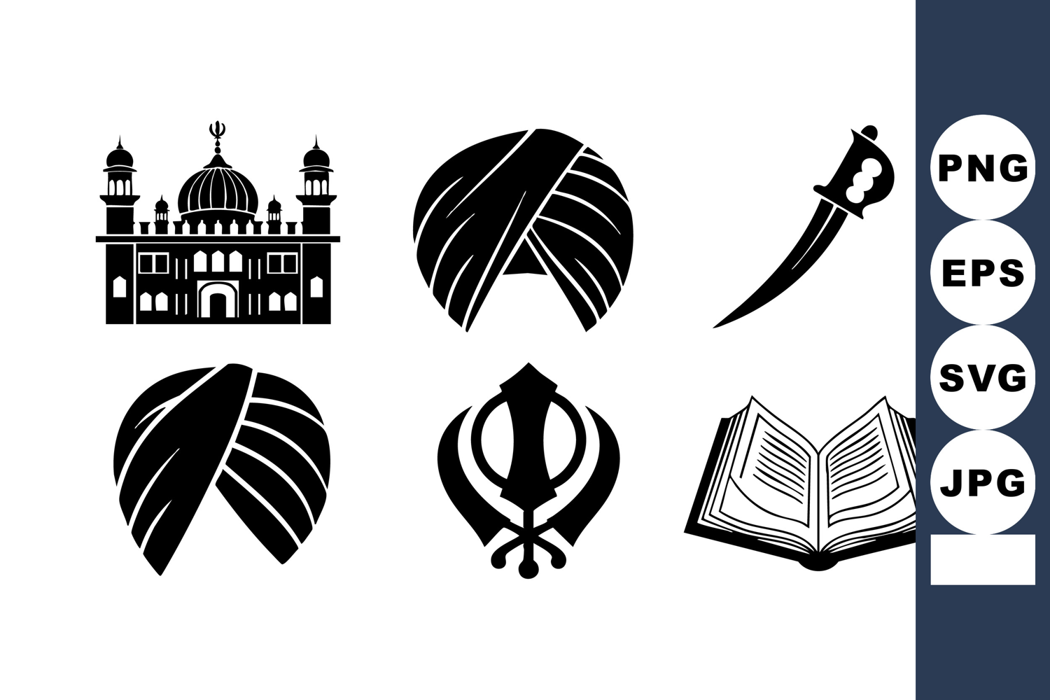 Bold graphic composition displays Sikh religious icons including gurdwara temple turban kirpan sword khanda emblem and holy scripture with a clean black silhouette style and spiritual mood