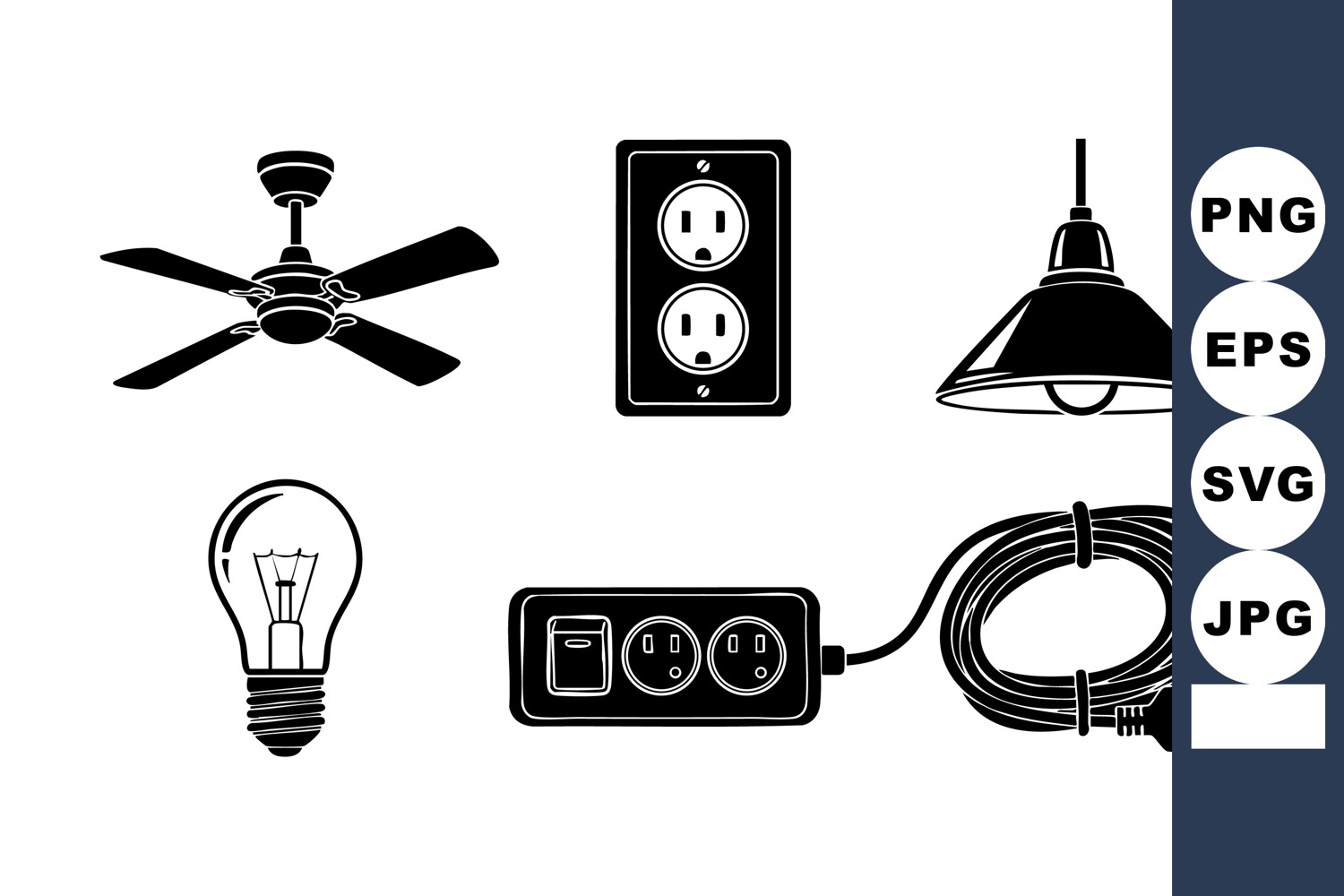 A clean and simple vector collection illustrates home electrical items including a ceiling fan, power outlets, light bulb, hanging lamp, and extension cord for versatile design use, modern and practical.