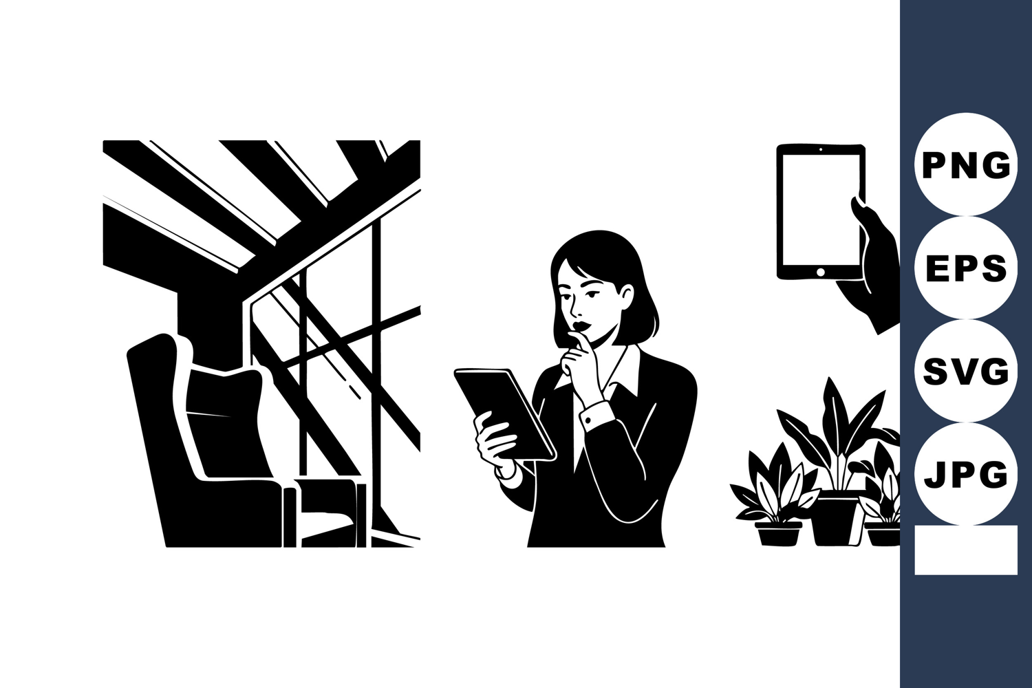 Modern Interior Design Black White Vector Calm Focused Atmosphere Woman Using Tablet Stylish Modern Interior Tablet Device Technology Potted Plants Foliage Stairs Silhouette Interior Armchair Chair Furniture Digital Communication Lifestyle