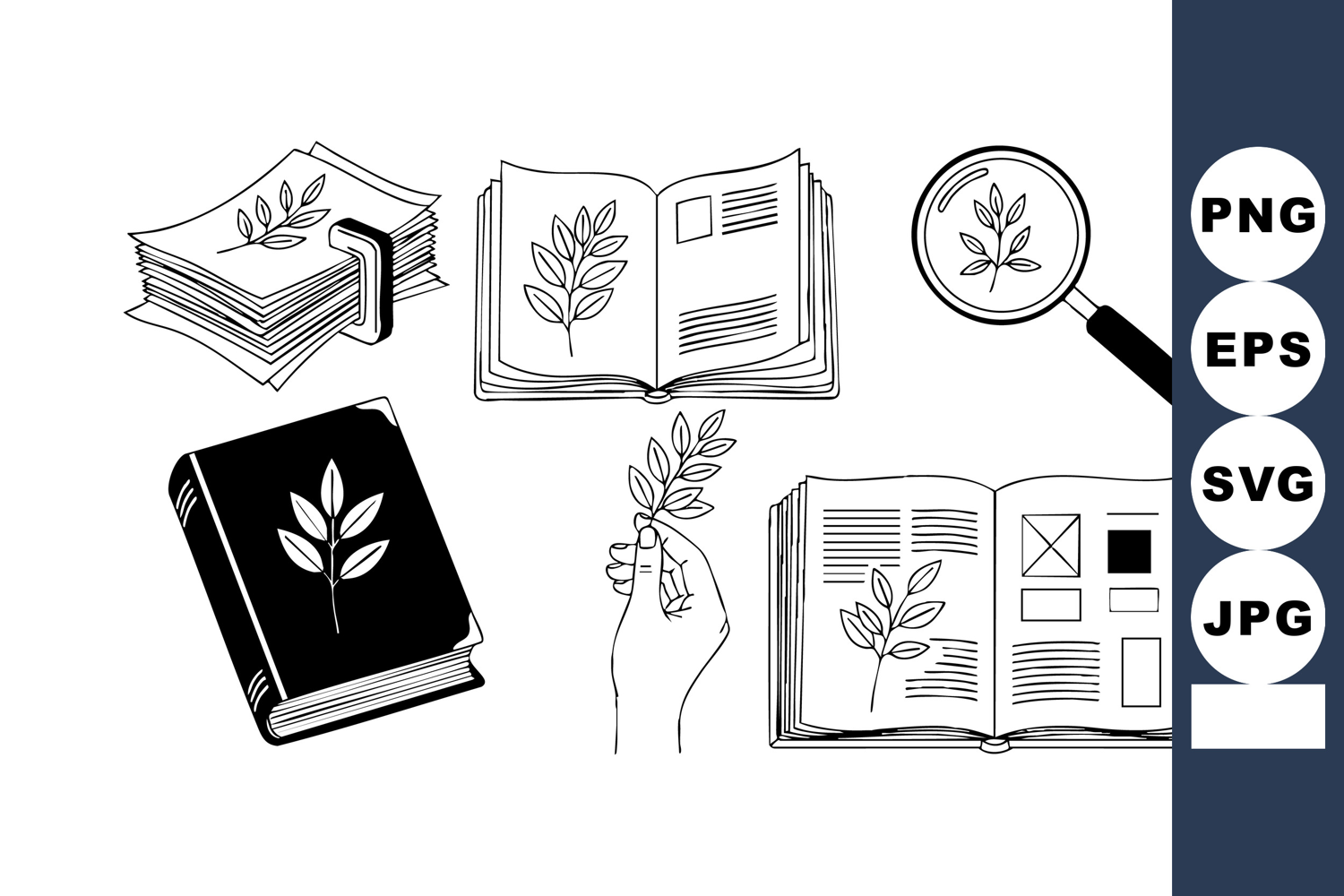 Black and White Botanical Book and Magnifying Glass Illustra example image 1