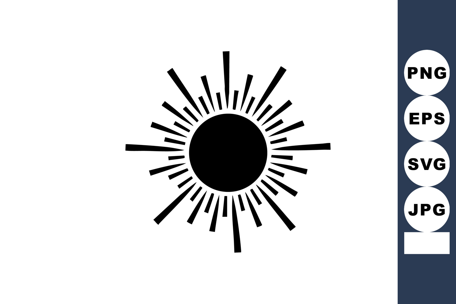 A bold black sunburst silhouette radiates dynamic rays outward in varying lengths creating a striking graphic element perfect for logos or decorative accents. Energetic and modern.