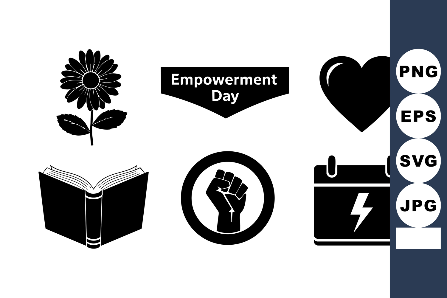 A bold graphic composition displays empowerment day symbols including a raised fist, heart, flower, open book, and a calendar with lightning bolt in a striking black silhouette style, inspiring strength and unity.