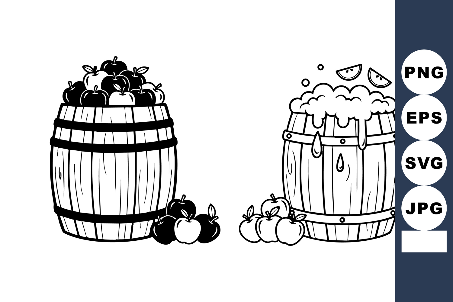 A detailed vector shows a wooden barrel filled with apples and another barrel overflowing with frothy cider and lemon slices creating a rustic and refreshing mood