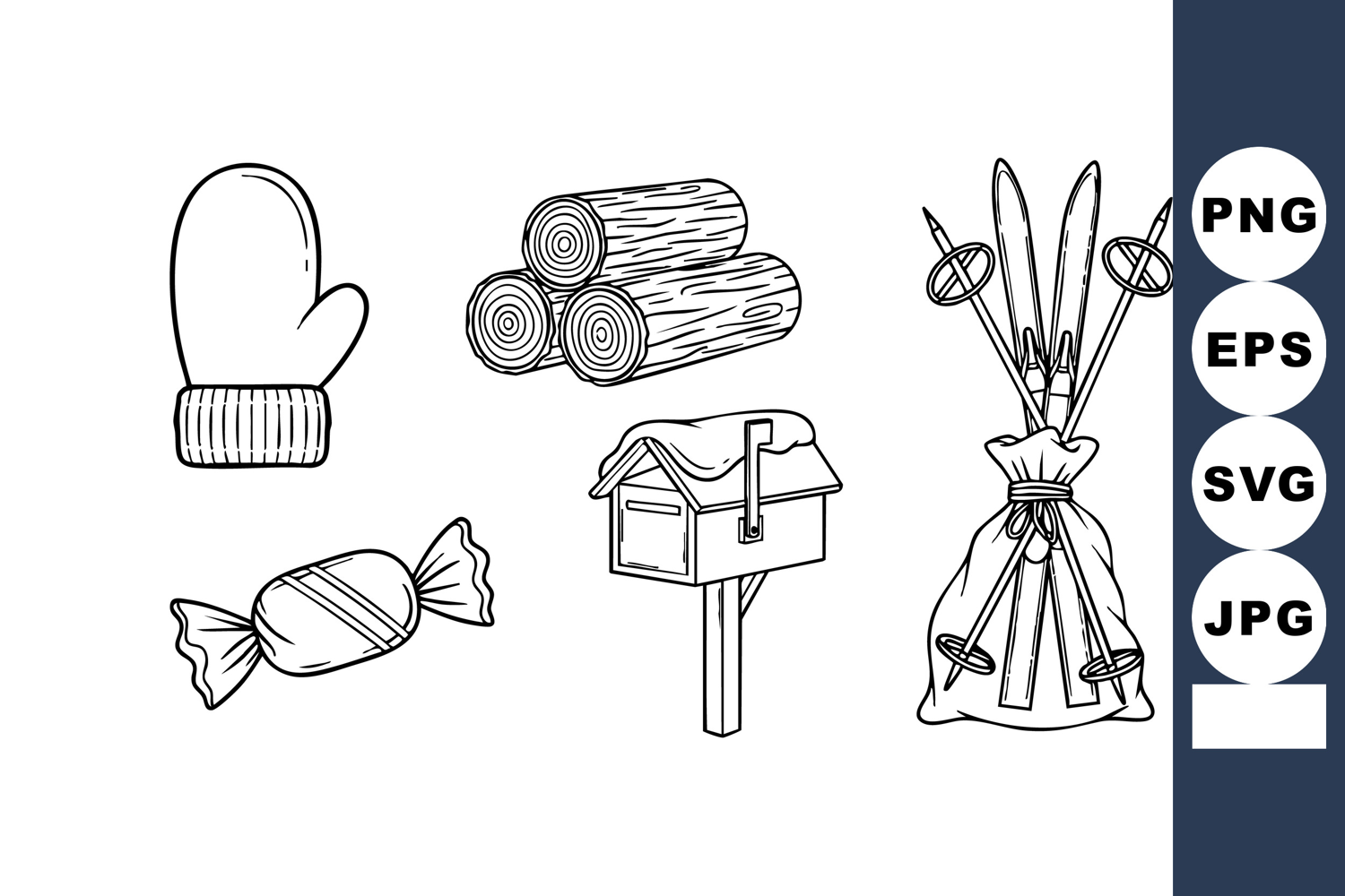 A simple black and white vector illustration displays winter glove logs mailbox candy and skis with poles in a minimal line art style perfect for seasonal designs and crafts calm.