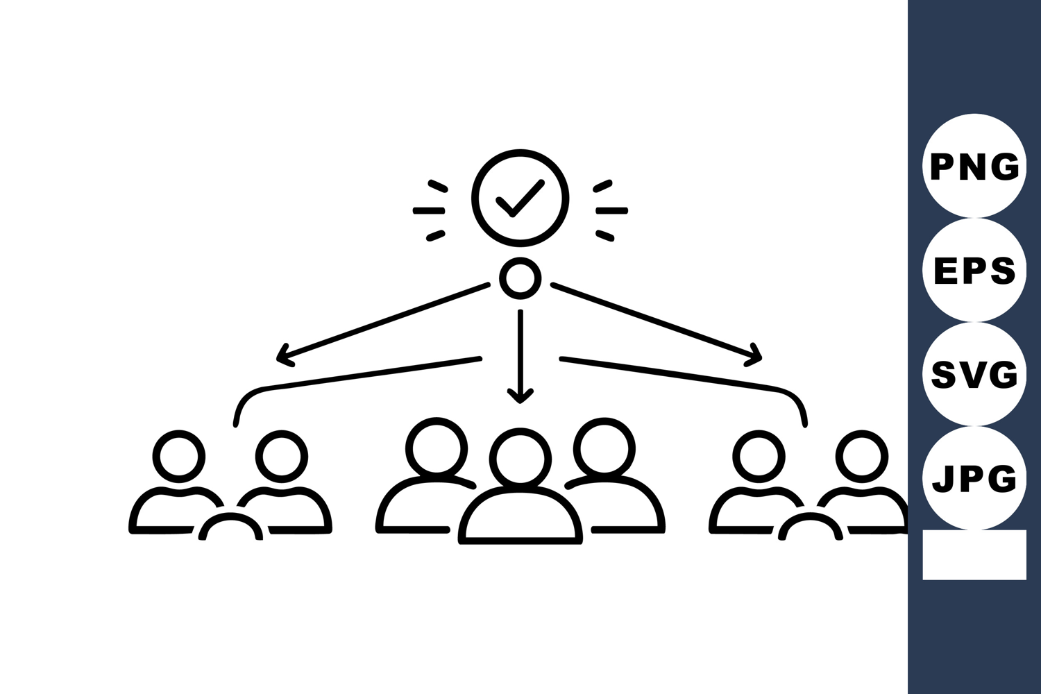 A clear line art vector shows a check mark above three groups of people connected by arrows indicating decision flow and teamwork in a business setting. Clean and modern style evokes clarity and cooperation