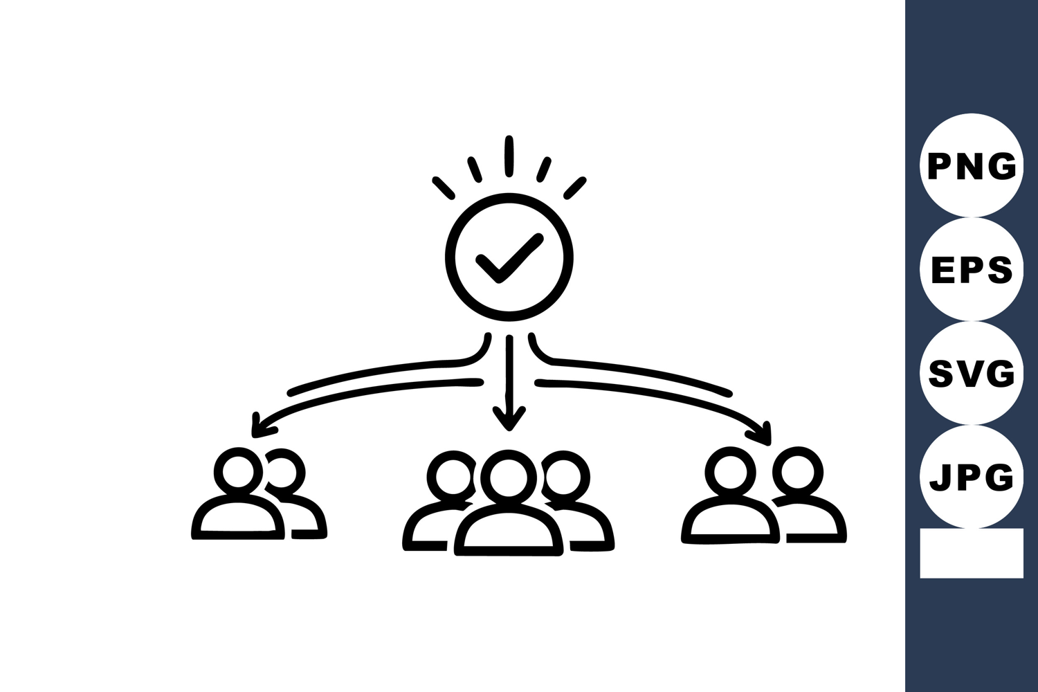 A simple black and white vector illustration depicts decision making with a checkmark symbol directing multiple groups of people representing choices and organization in a clear style and calm mood