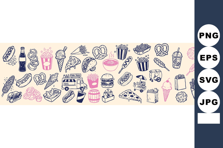 This playful vector art showcases a variety of fast food items in a whimsical kids doodle style, ideal for use in graphic design projects related to food menus, educational materials, or childrens book illustrations. Vibrant and fun.