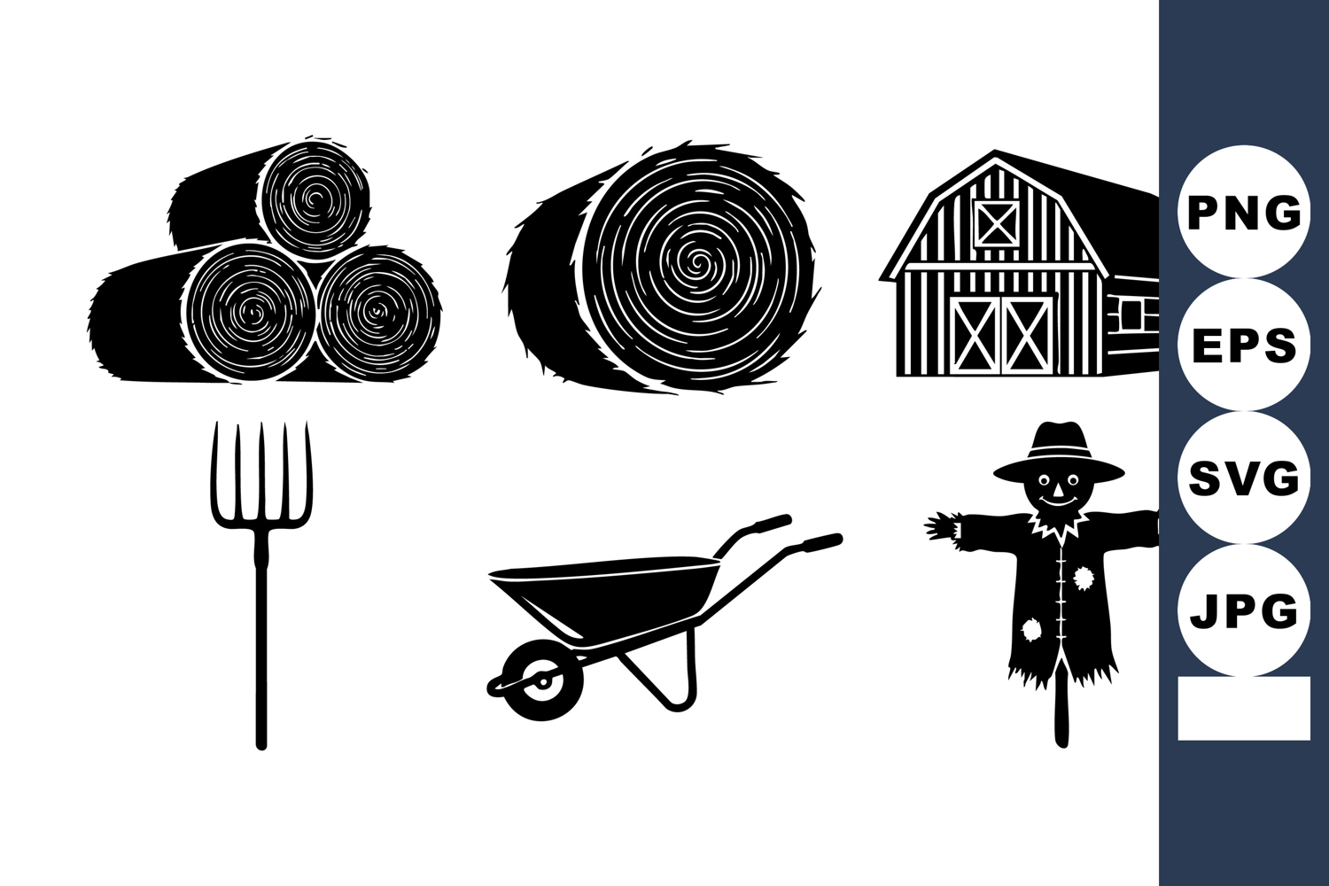 Hay Bale Vector Farm Hay Silhouettes Rustic Farm Iconset Barn Silhouette Graphic Wheelbarrow Farm Tool Pitchfork Farm Icon Smiling Scarecrow Illustration Rural Agriculture Symbols Minimal Farm Design Countryside Harvest Elements