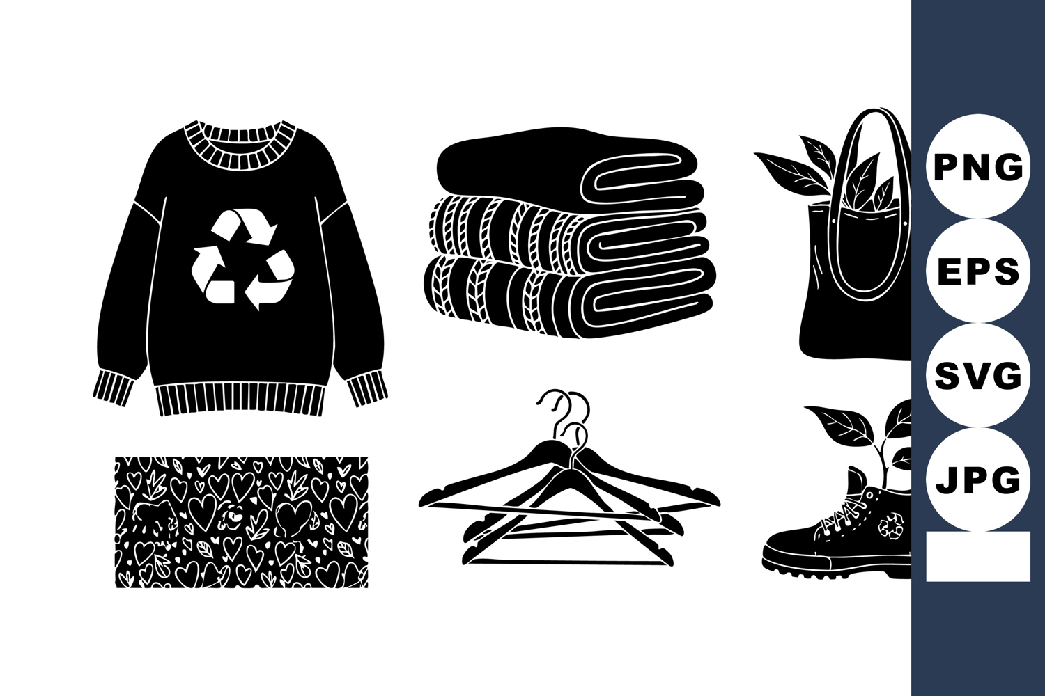 Eco Clothing Icons Sustainable Fashion Silhouettes Recycle Sweater Illustration Folded Towels Vector Leafy Eco Tote Heart Pattern Fabric Wardrobe Closet Hangers Sprouting Eco Boot Minimal Monochrome Fashion Eco Branding Graphics
