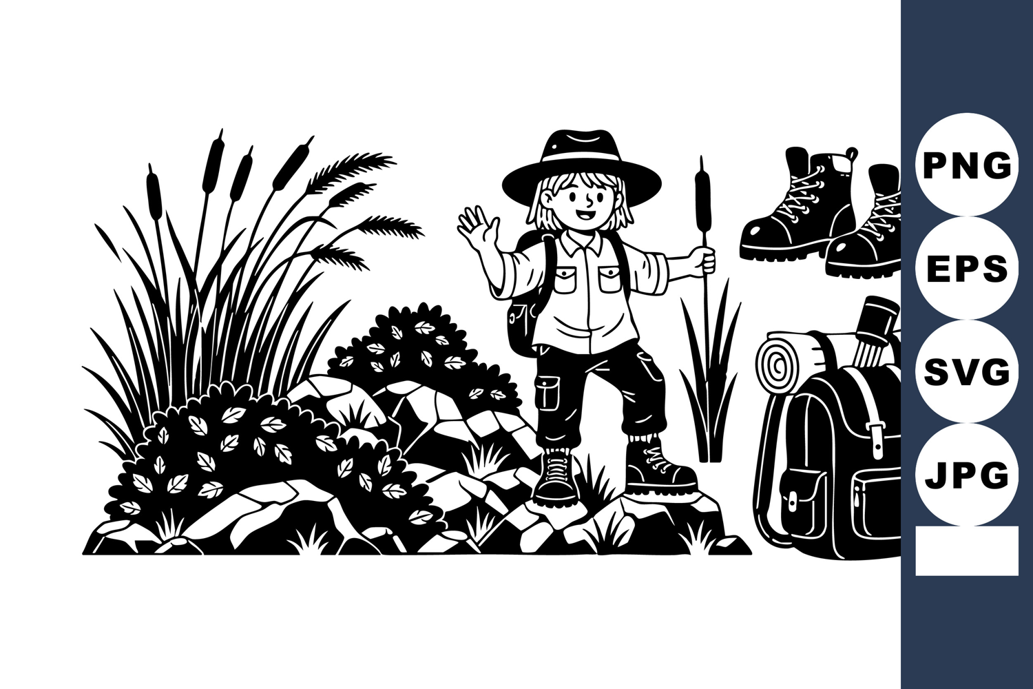 Cheerful child hiker stands on rocky hillside surrounded by cattails and bushes, with separate backpack, boots, and camping gear elements, in bold black and white flat vector style, adventurous.