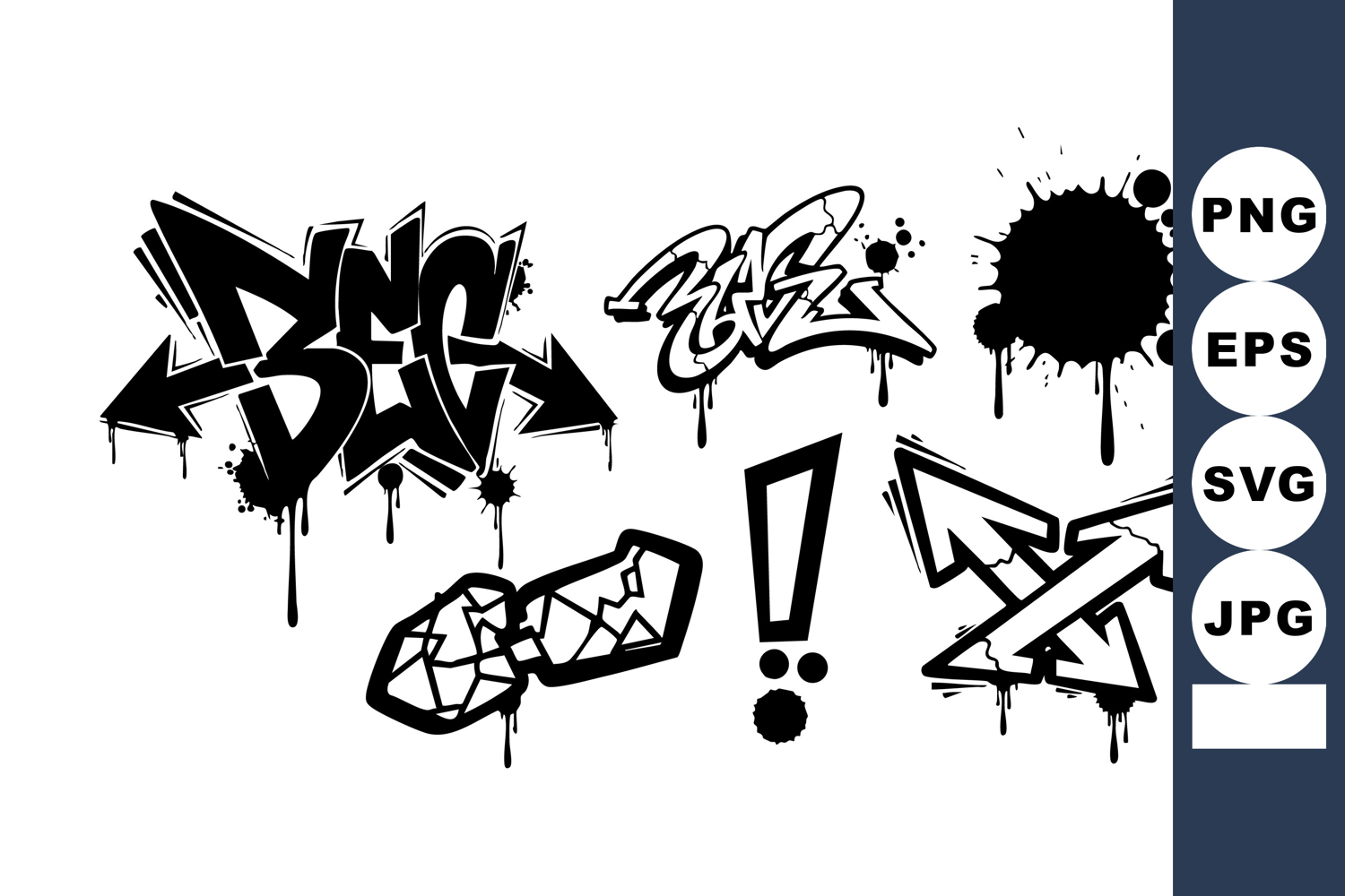 Urban graffiti collection presents bold decwg lettering, expressive spray drips, cracked knuckles, arrows and exclamation mark in monochrome vector style, ideal for street posters, apparel graphics, or edgy web headers, rebellious.