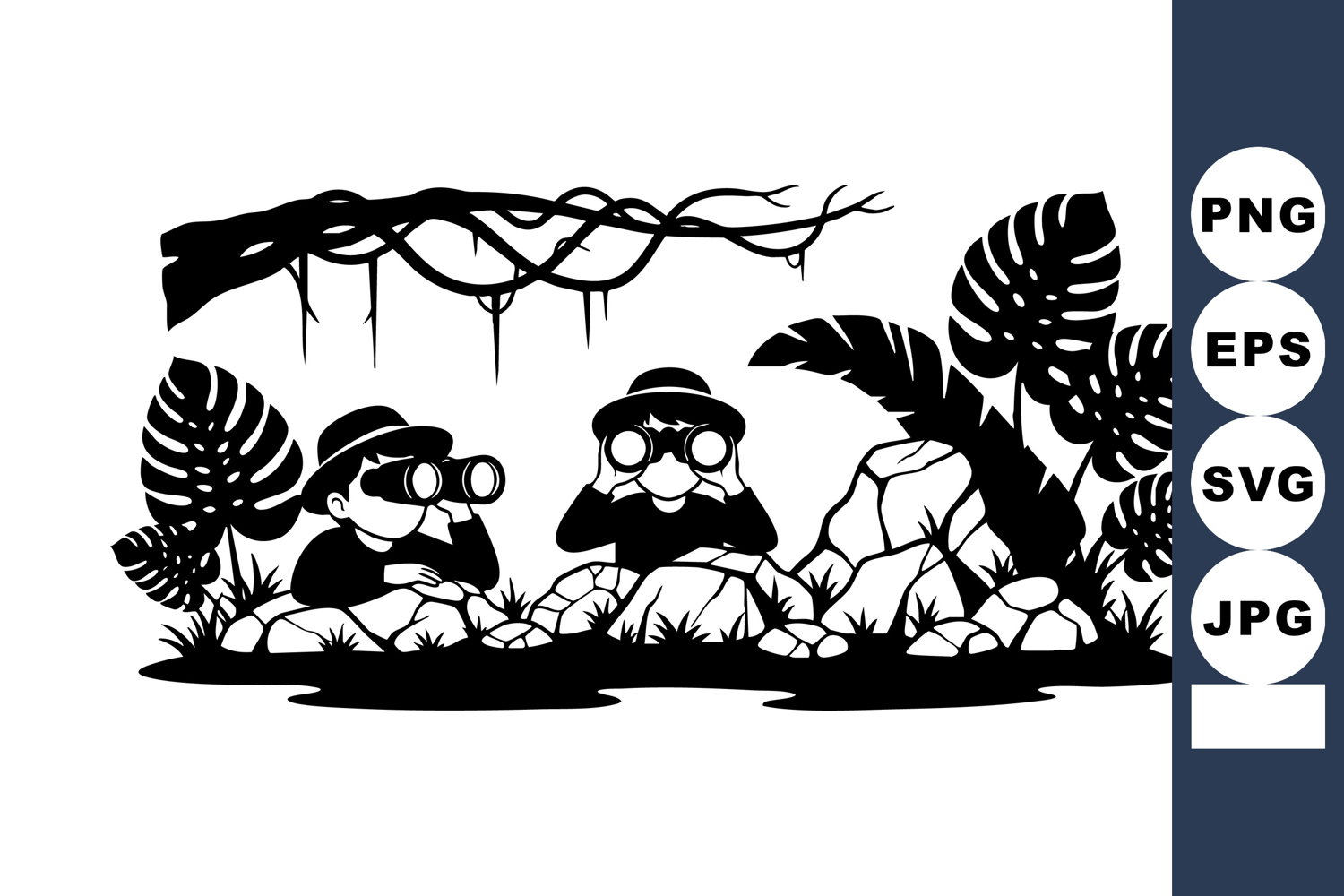 Silhouette artwork depicts two young explorers crouching behind rocks, watching through binoculars among large jungle leaves and hanging vines, in simple flat design style for children projects and adventure graphics, playful.