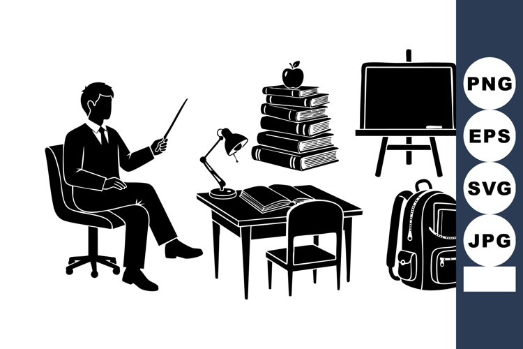 Flat Design Icons Seated Male Teacher Male Teacher Pointing Black Silhouette Teacher Student Desk Chair Desk And Chair Open Book Desk Stacked Books Apple Chalkboard Easel Icon Backpack And Lamp