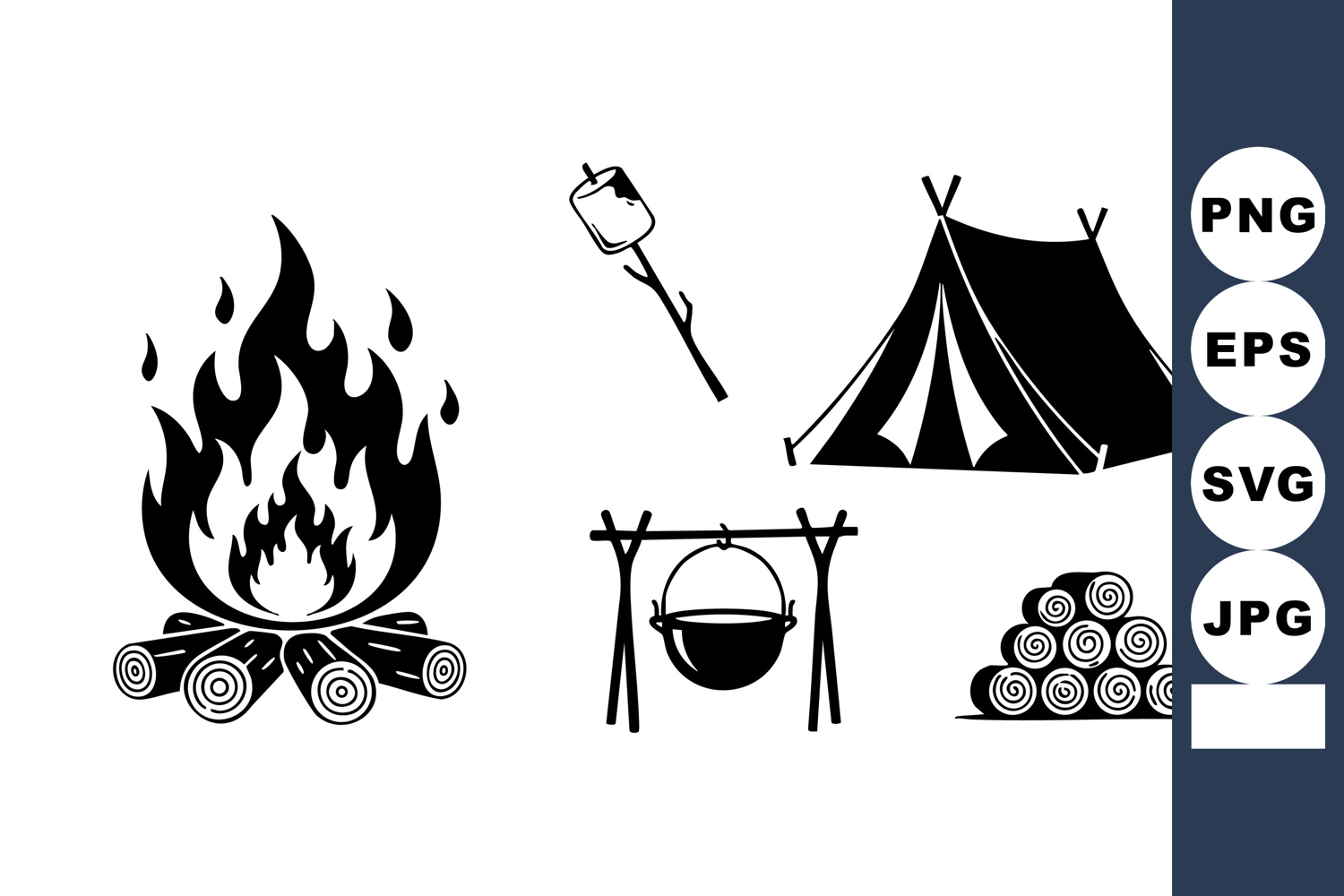 Bold Black Silhouettes Minimalist Camping Icons Flat Camping Graphics Campfire Tent Marshmallow Stacked Firewood Logs Hanging Cooking Pot Outdoor Adventure Symbols Summer Campfire Design Scouting Themed Graphics Vector Camping Collection