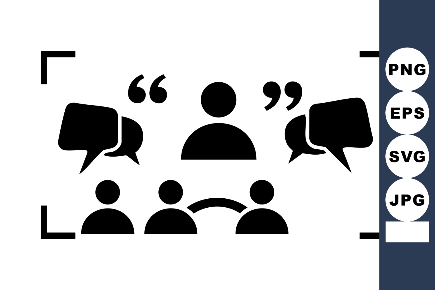 Simplified black pictogram composition displays speaker avatar, quotation marks, speech bubbles and group meeting silhouettes inside framing corners, ideal for interface buttons, presentation slides, webinar branding and collaboration themes, modern.