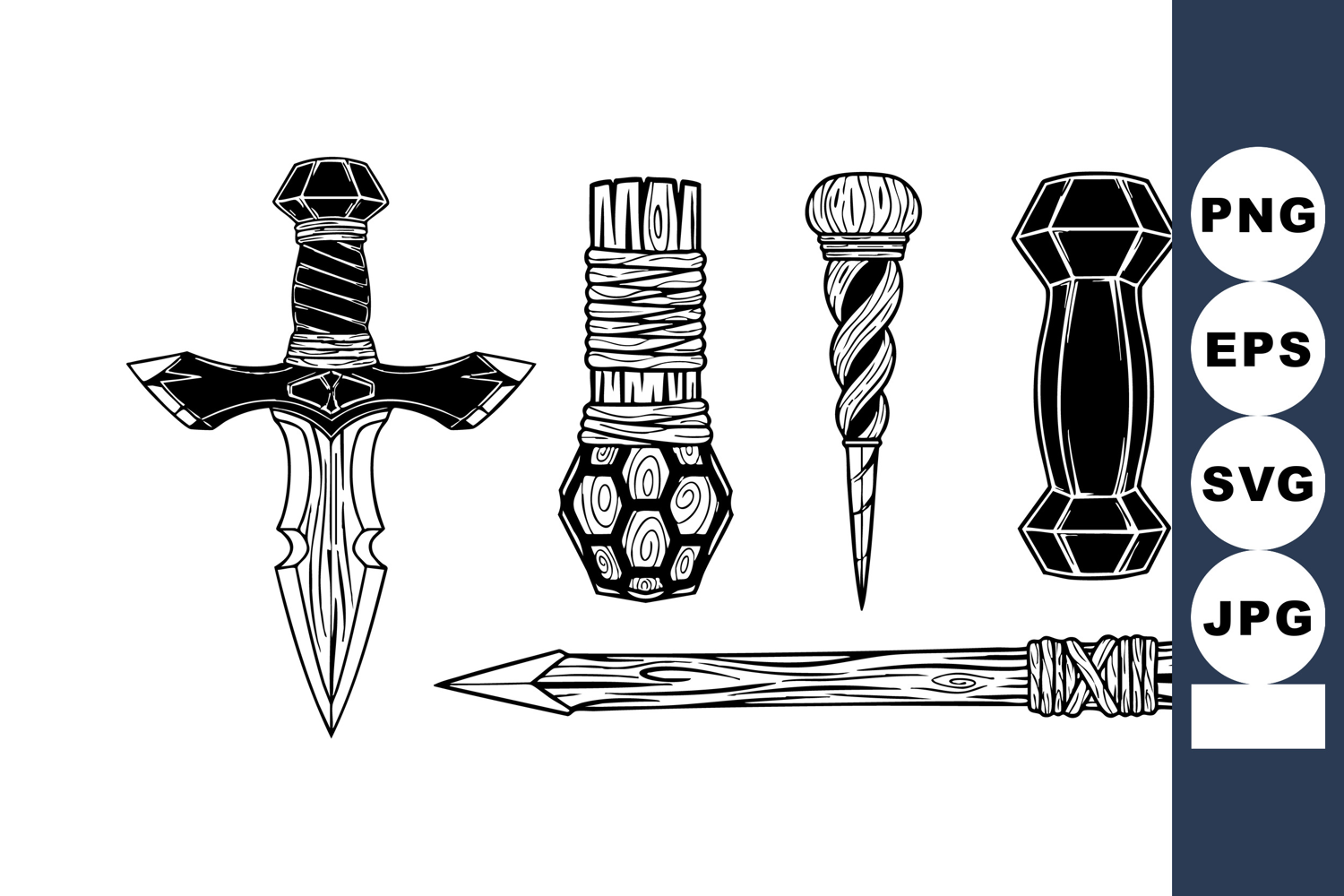 Black And White Bold Graphic Style Fantasy Ritual Weapons Line Art Weapons Wrapped Handle Details Faceted Stone Forms Dagger Wand Stake Club And Staff Game Interface Assets Tattoo Design Motifs