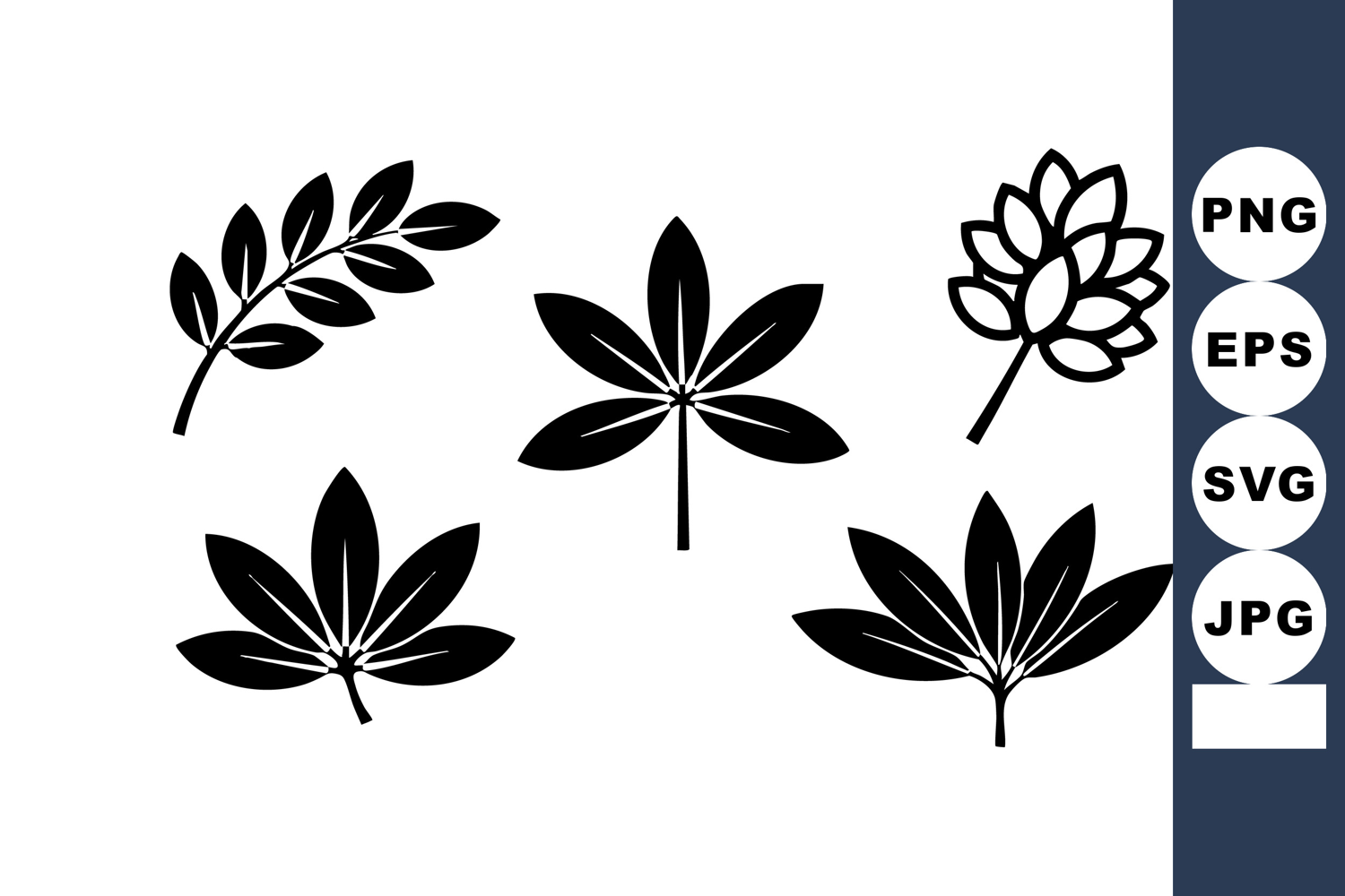 Grouped botanical silhouettes display five different black leaf shapes in minimalist flat vector style, ideal for logos, pattern design, packaging, and modern nature themed branding projects, calm.