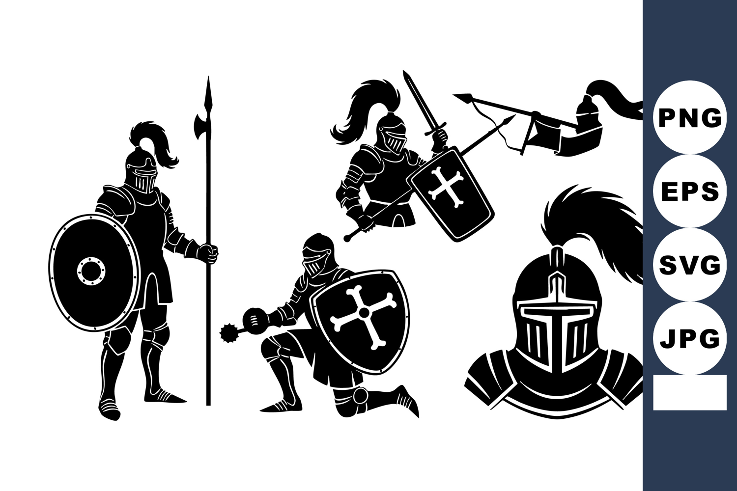 Black White Silhouettes Medieval Knights Set Crusader Shield Icon Flat Silhouette Knights Heroic Knight Poses Armor Helmet Profile Spear Sword Mace Emblem Logo Knights Tournament Crest Design Vintage Medieval Emblem